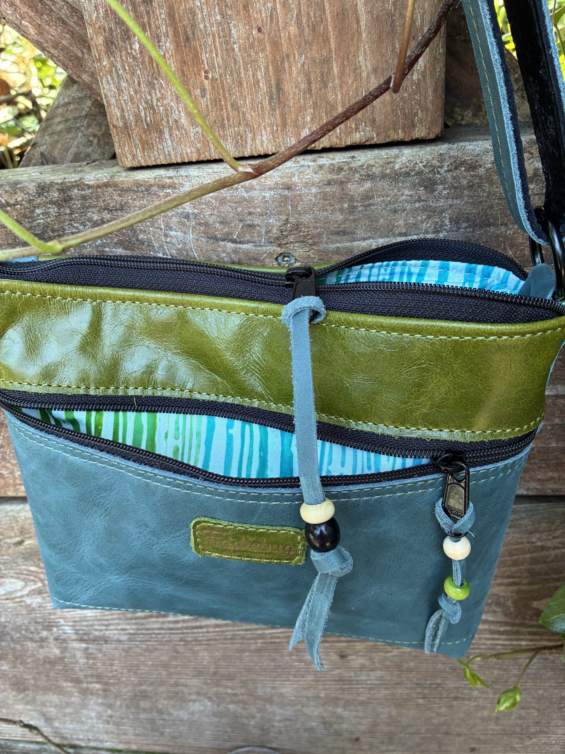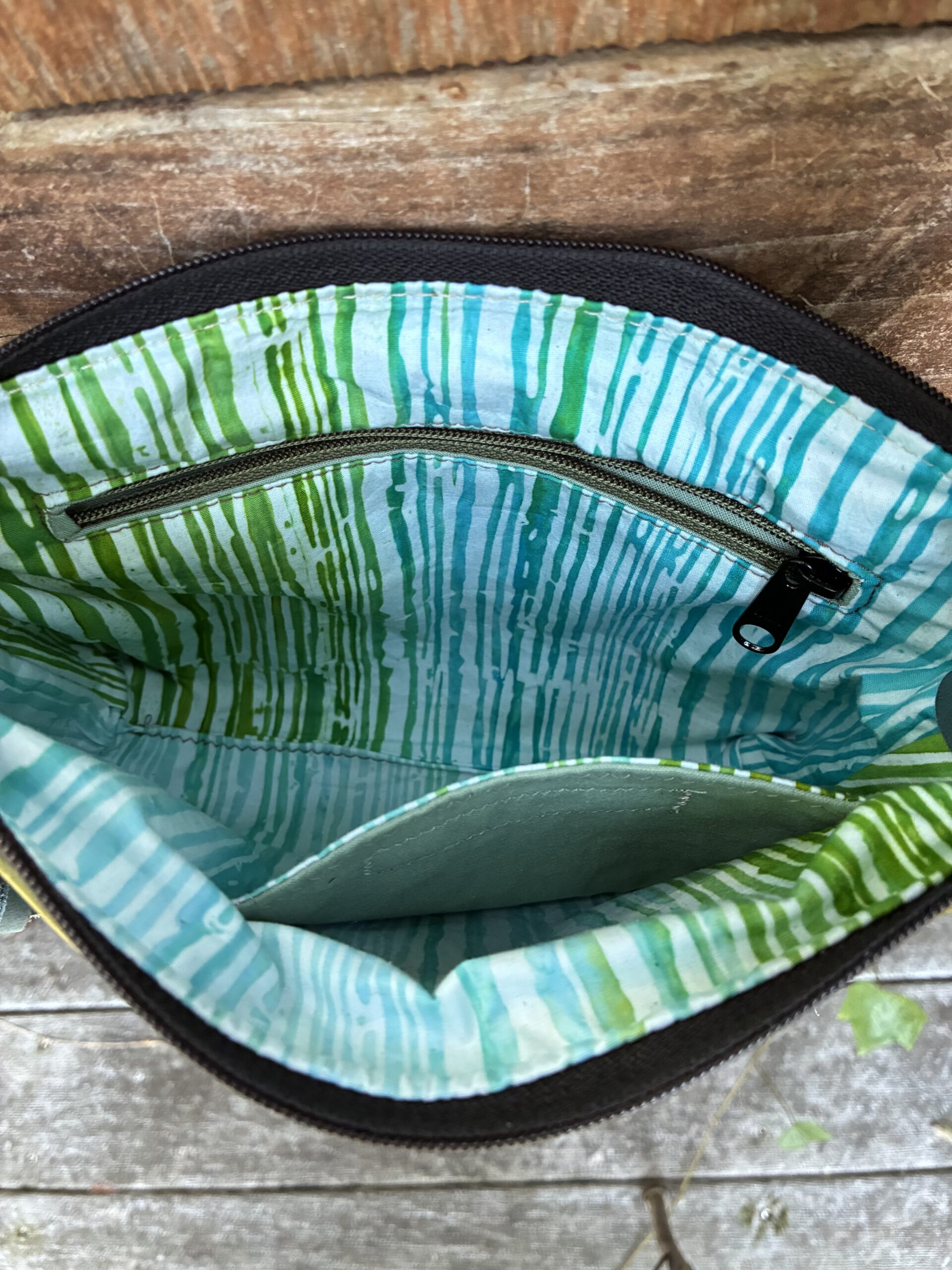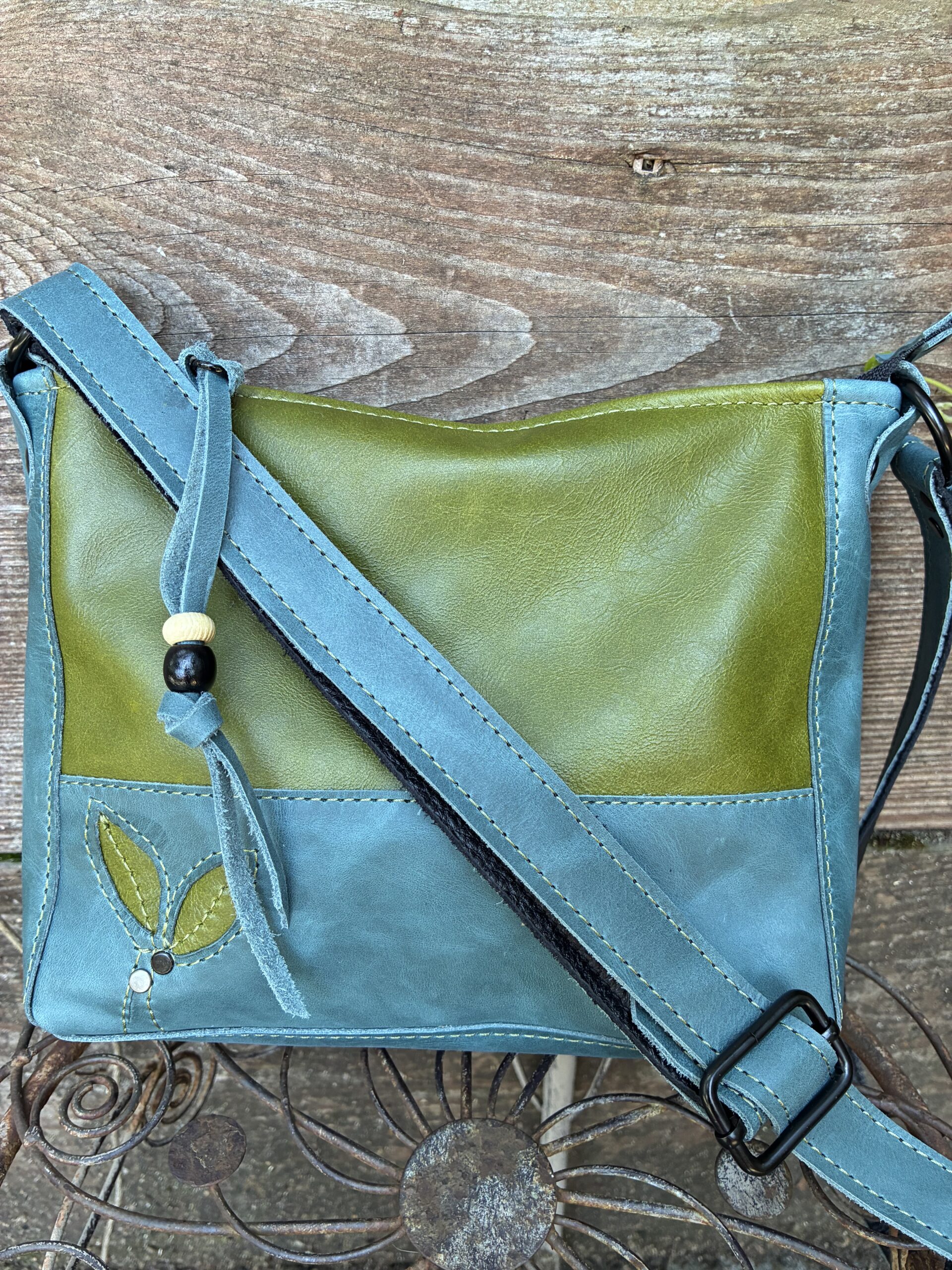 I had fun making this bag as it evolved into a stunning design. Leather appliqué, two vibrant colors and black highlights, sets this bag apart. Outer zip pocket, interfaced cotton lined with zip pocket and slip pockets. Zip closure.