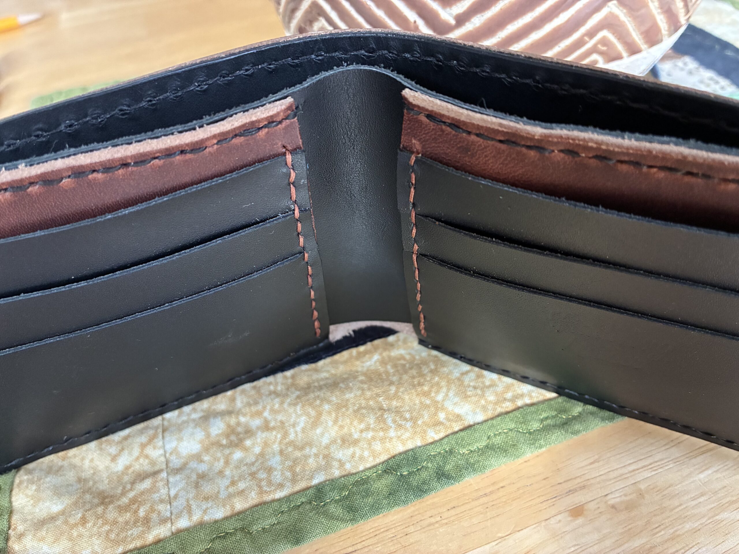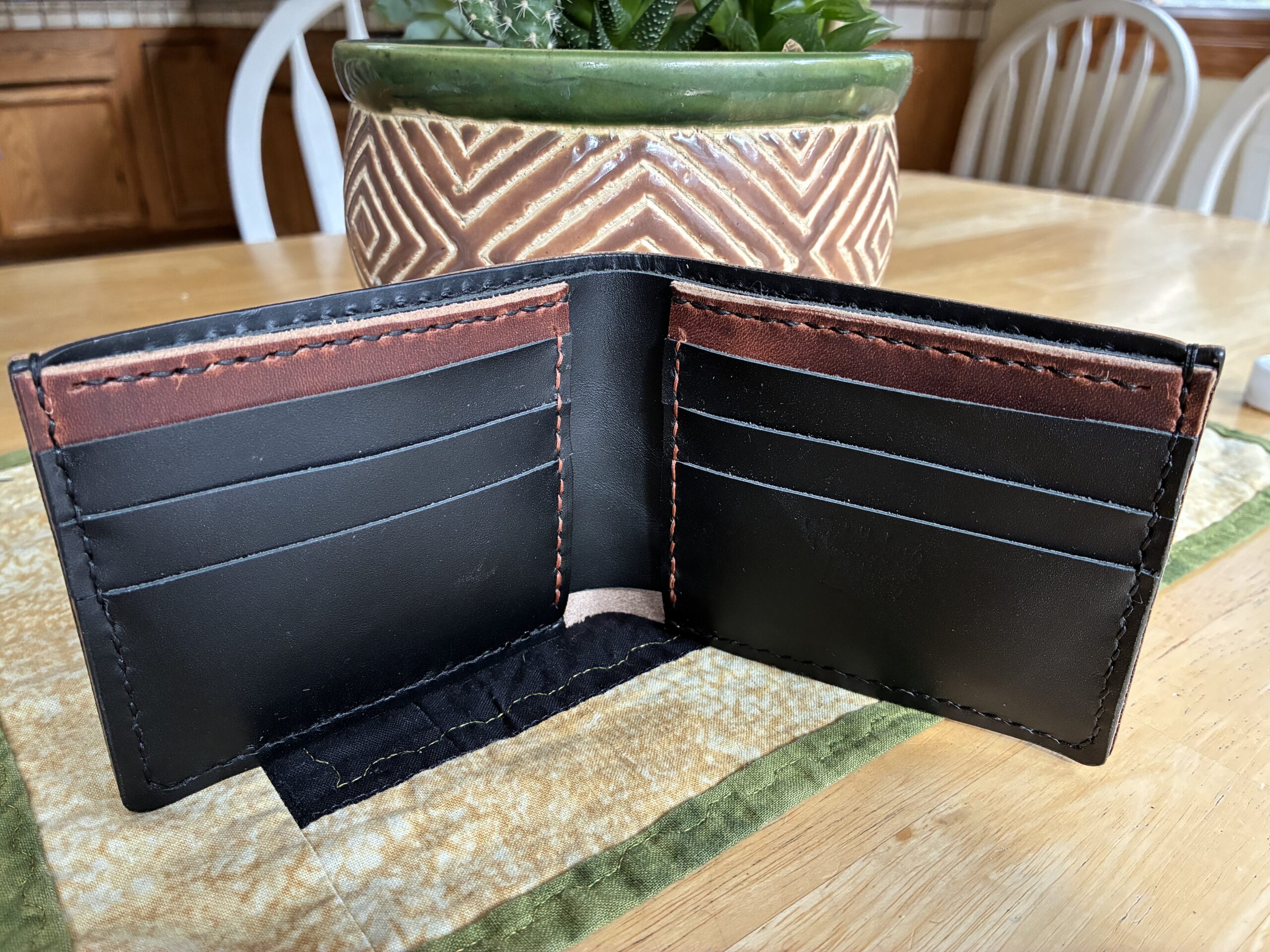 Full grain brown and black leather bifold features 6 card slots, 2 hidden pockets and long cash sleeve.