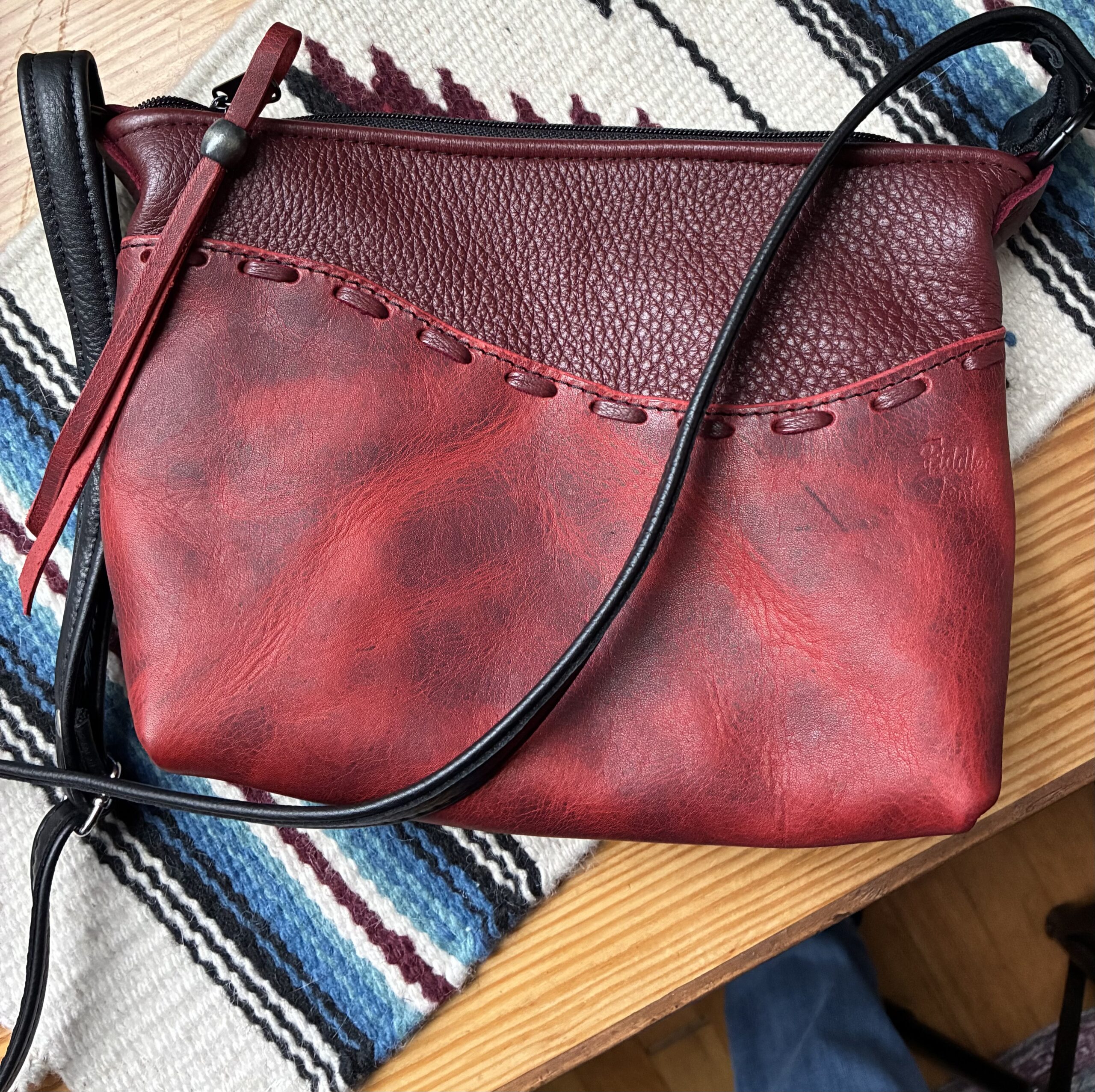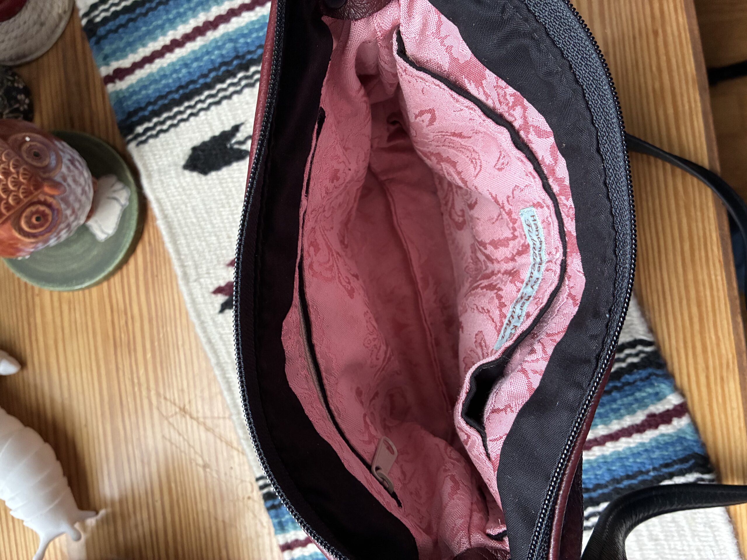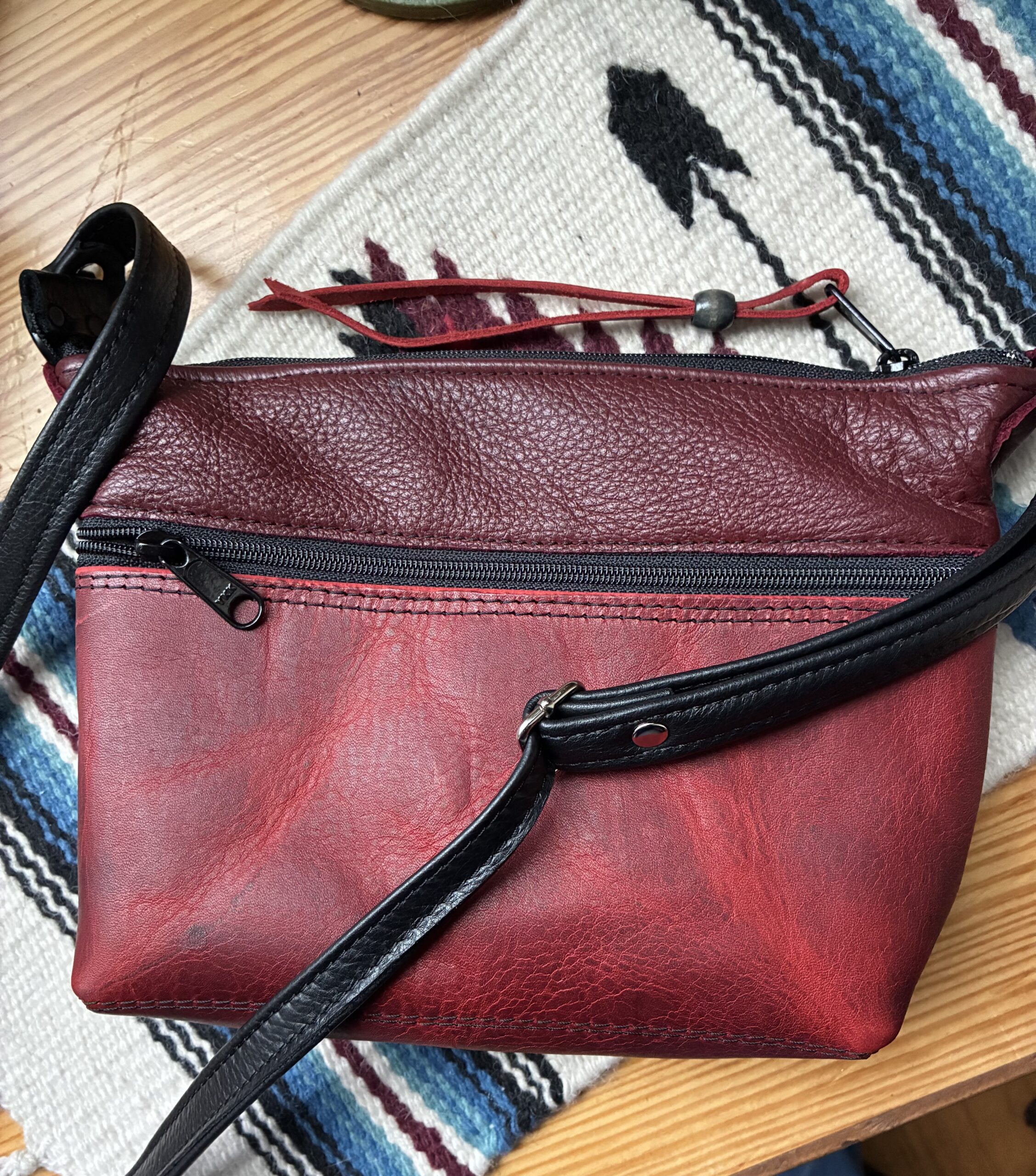 Cranberry deerskin paired with a rustic red full grain leather. Zip top, rear zipped pocket. Interior, interfaced Pink fabric, with zip and open pockets.