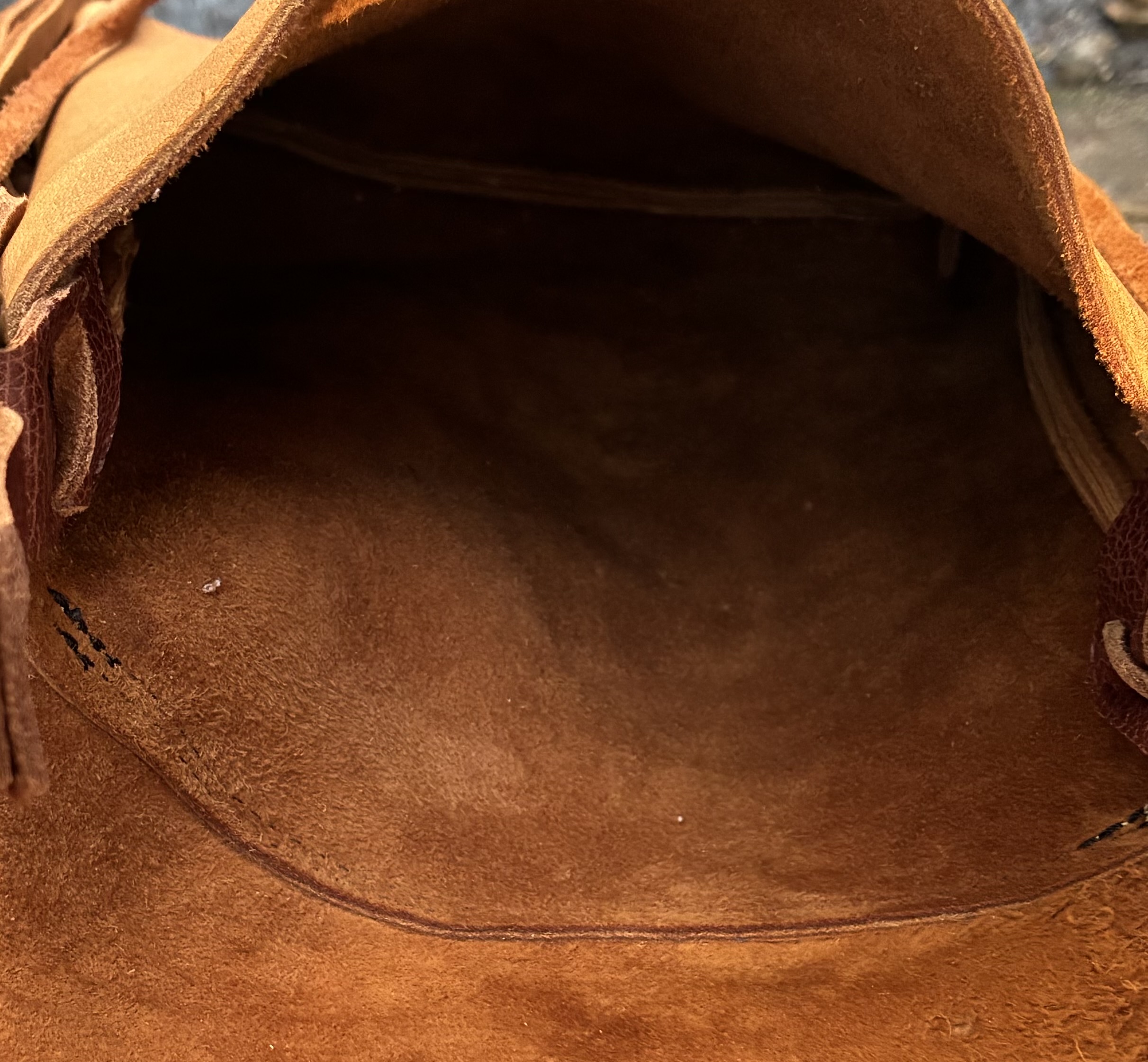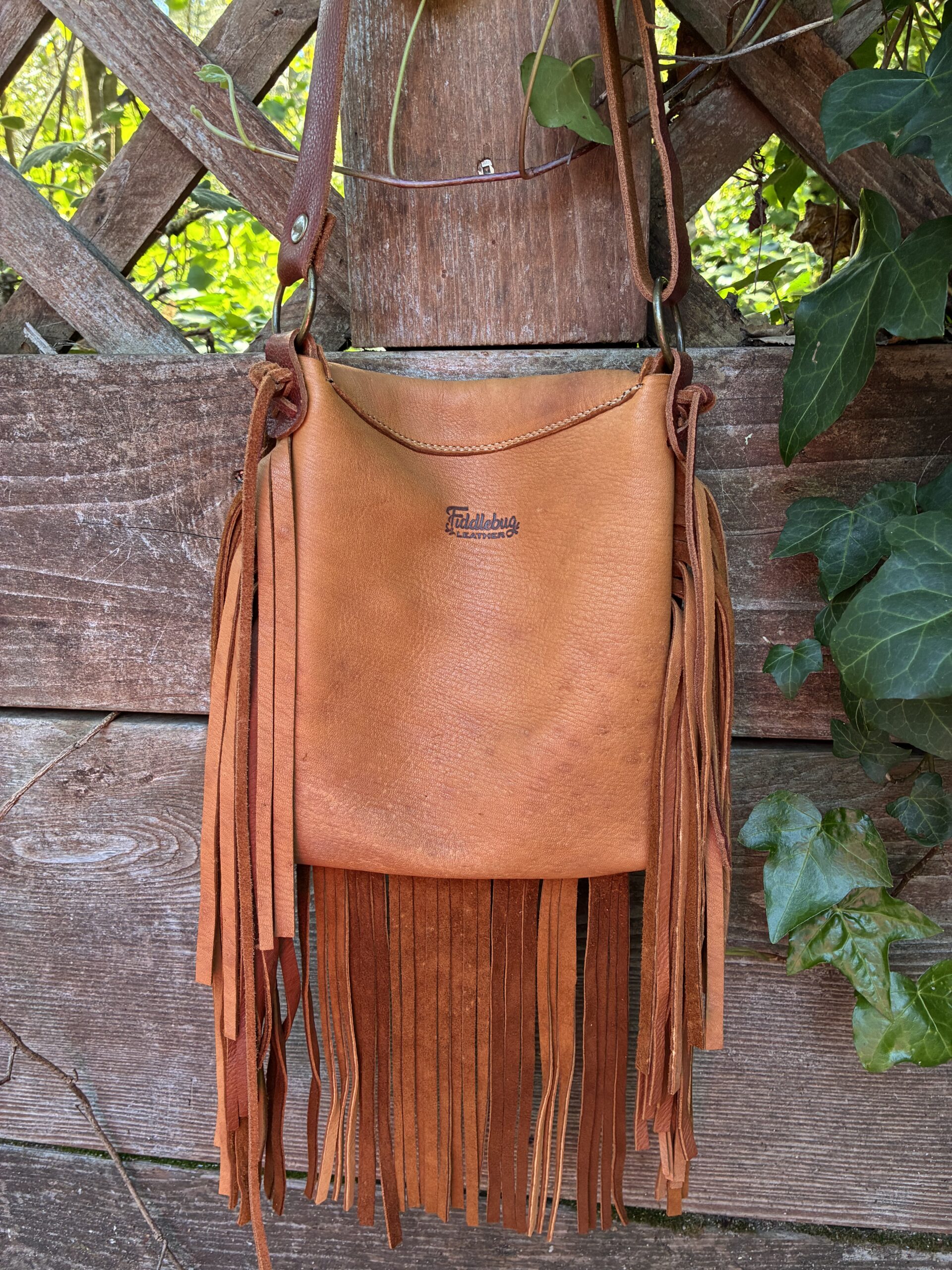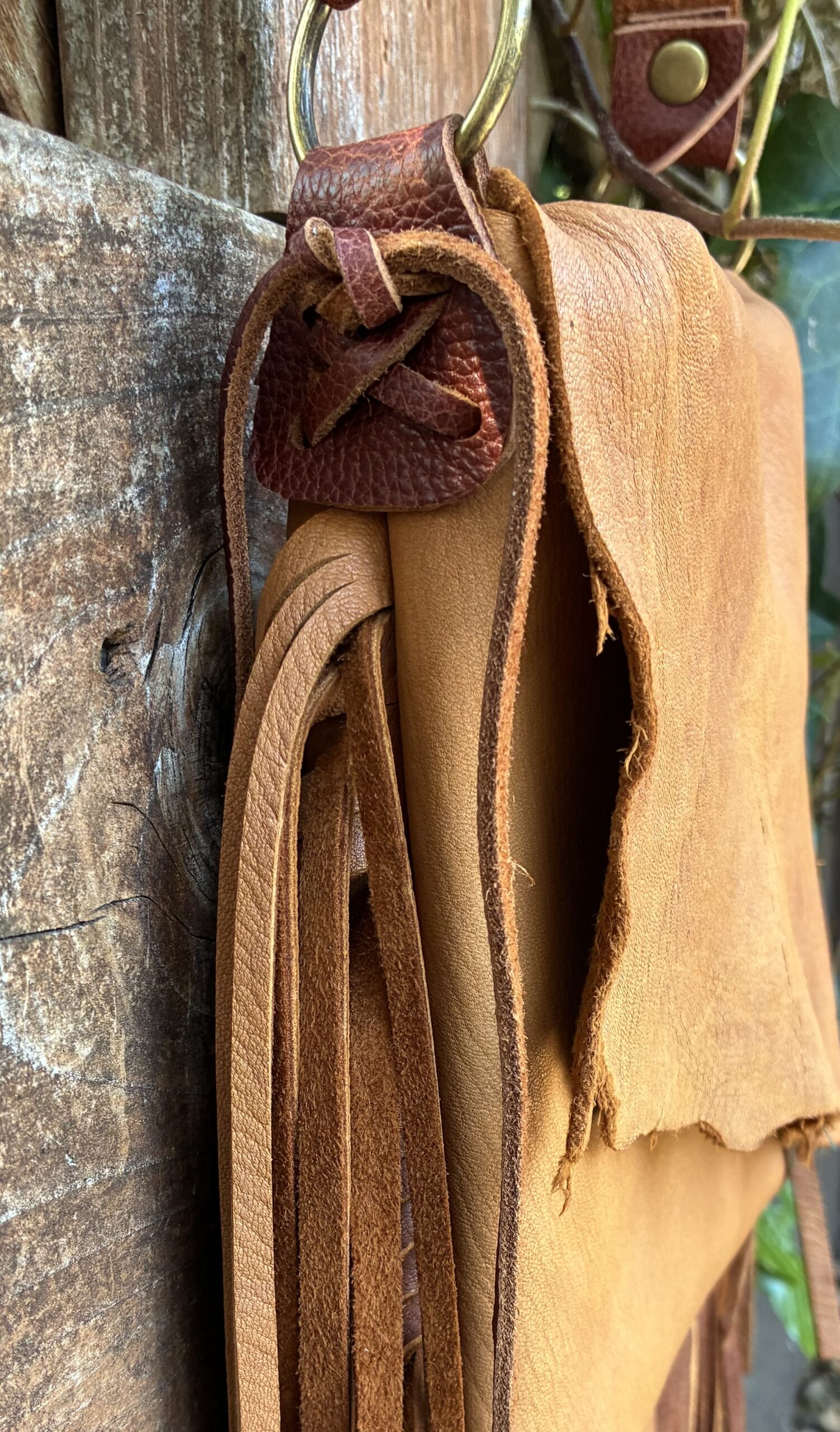 Gorgeous, soft and tough buckskin fringe bag. Simple, elegant design.. 8” fringe, adjustable 48” Burnt Maple leather adjustable strap. Natural suede interior. 8” flap