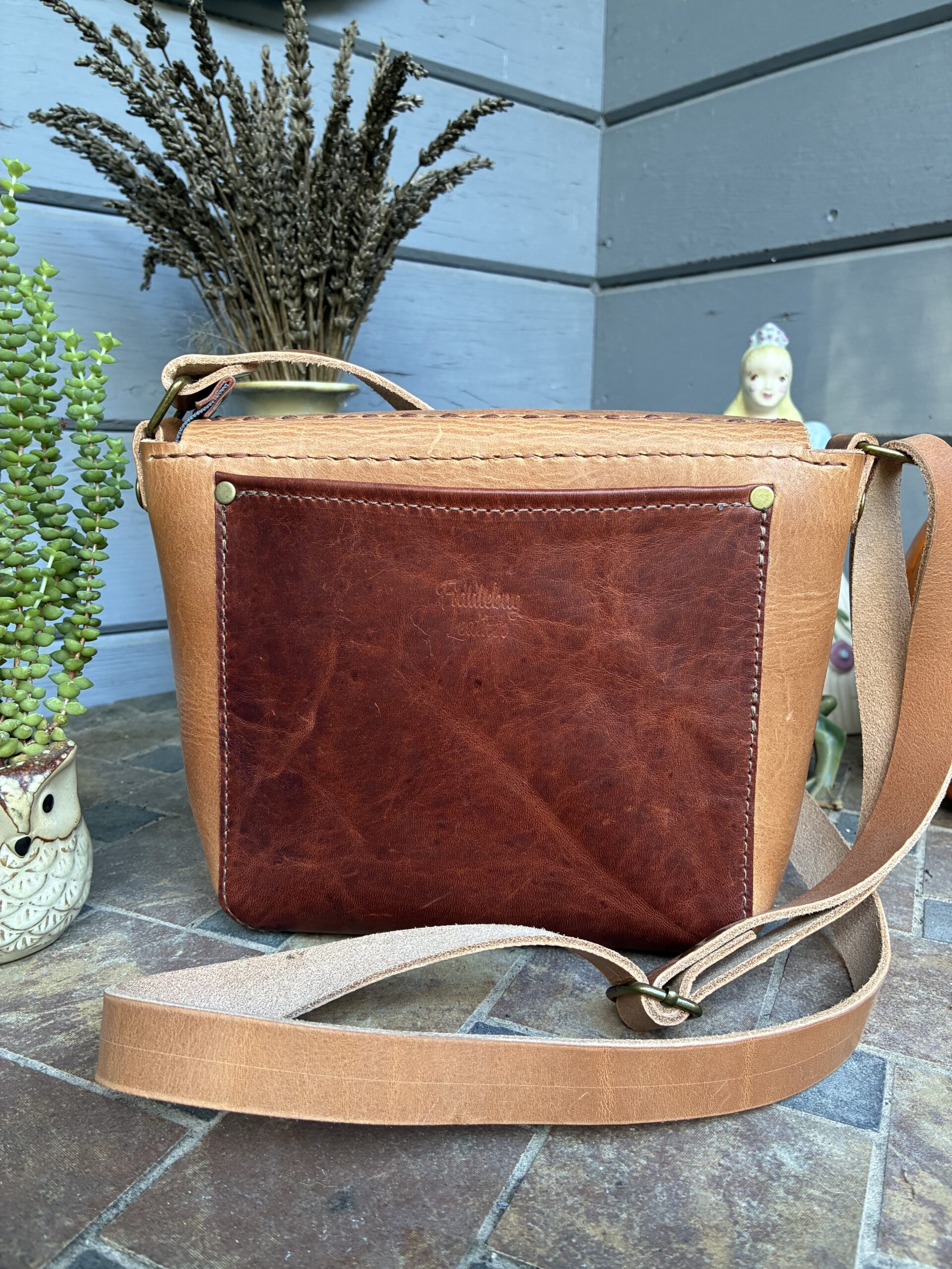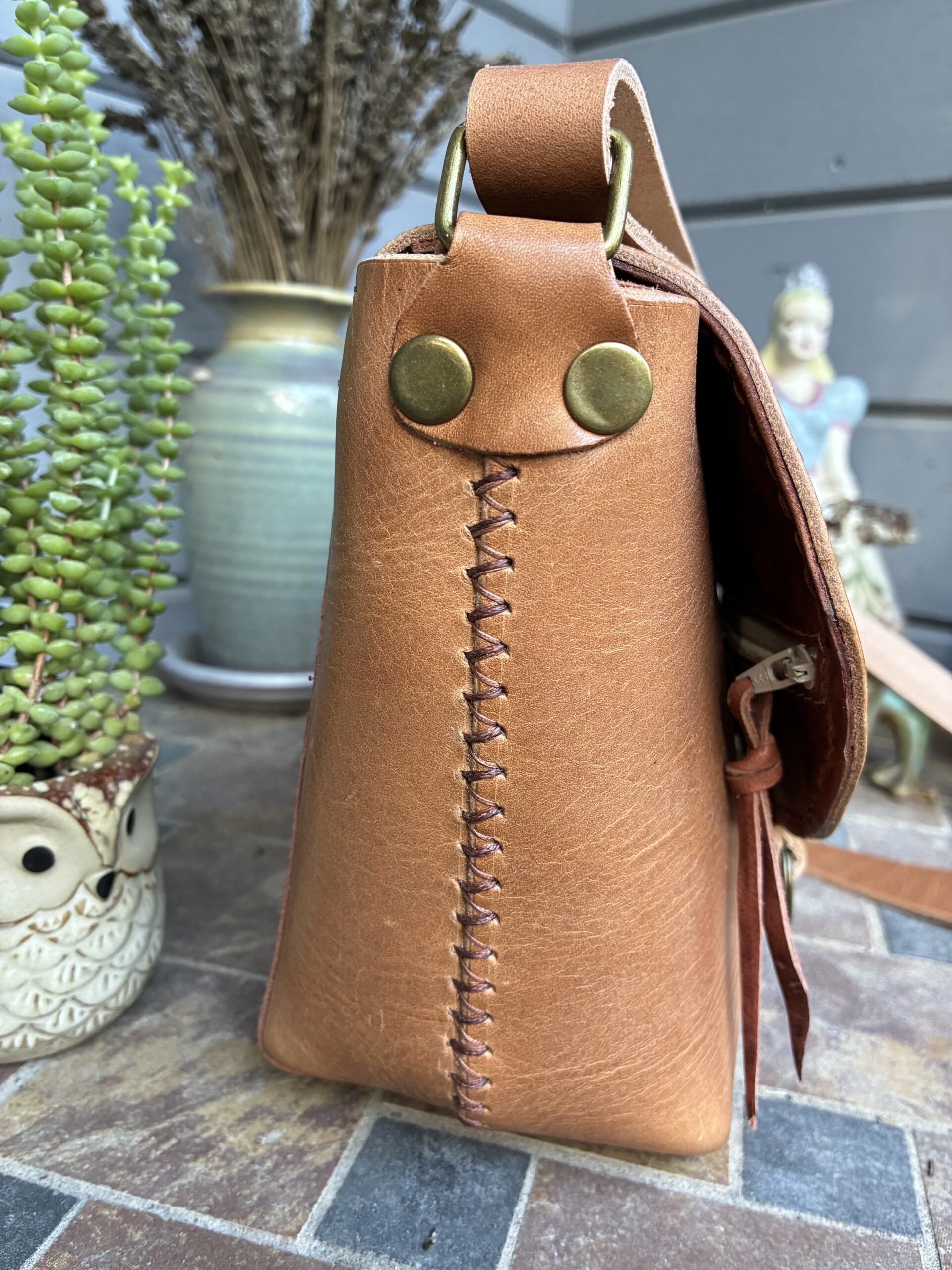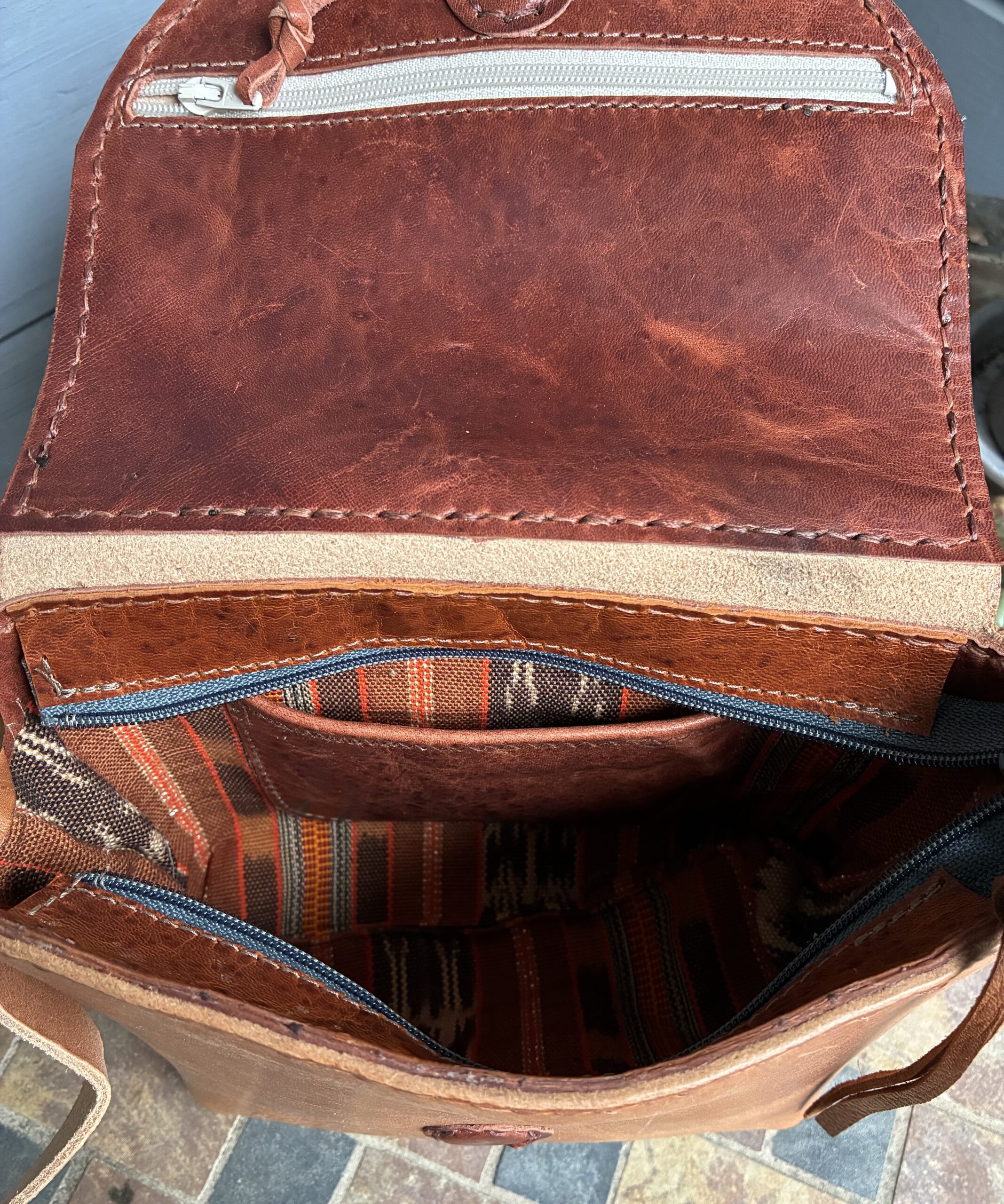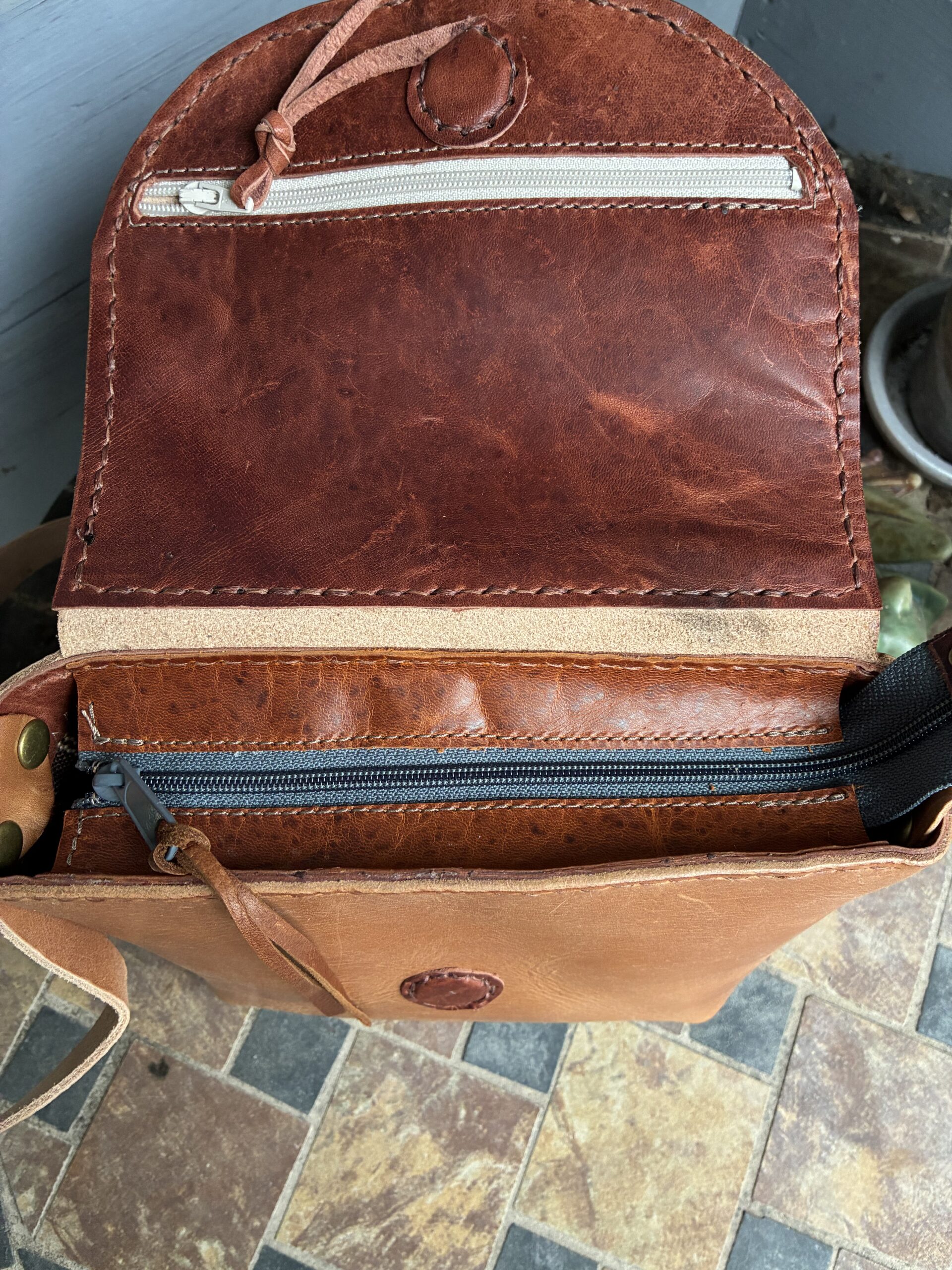 Natural Tan full grain leather crossbody bag. Handstitched with “Havana cigar”Ritza Tiger thread. Central American cotton fabric lined. Outer and inner open pocket, zip flap pocket and zip closure. Magnet on flap. This is one secure bag with hidden treasures within.
