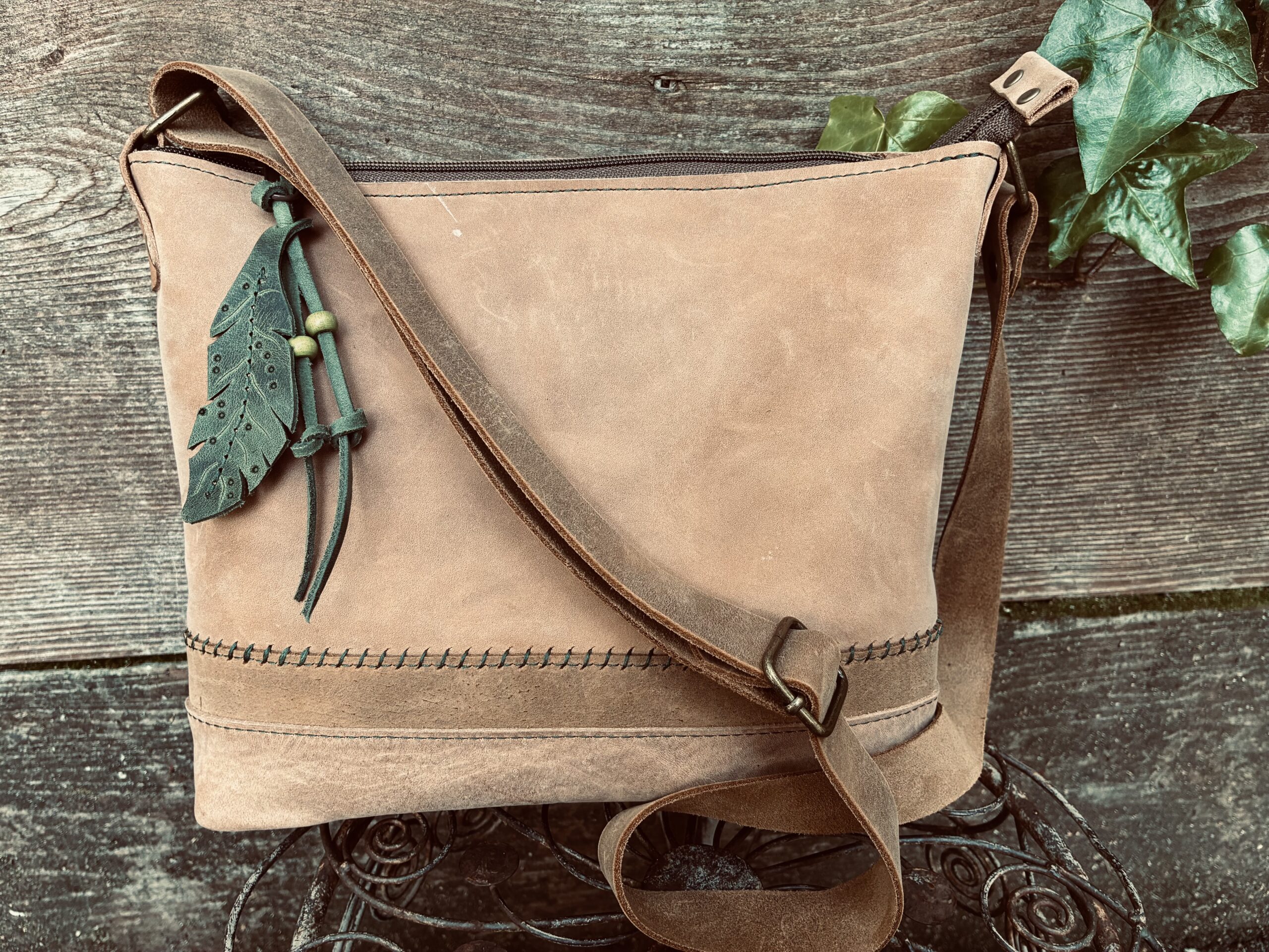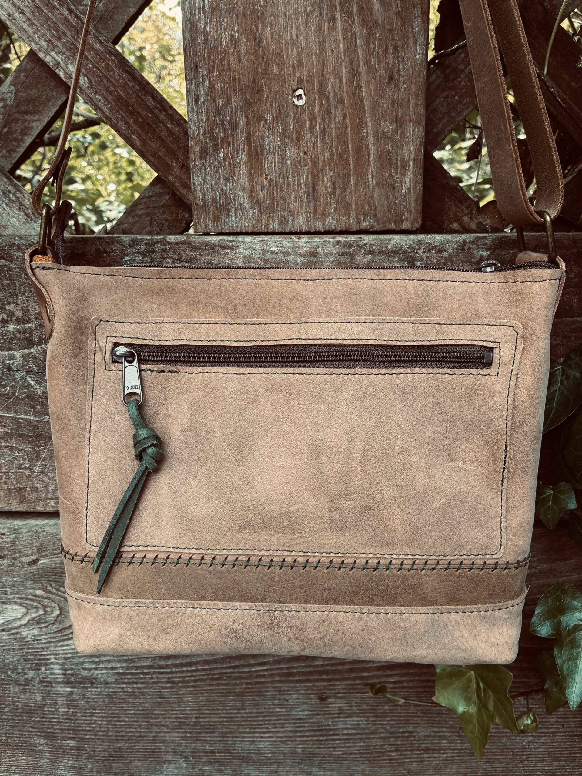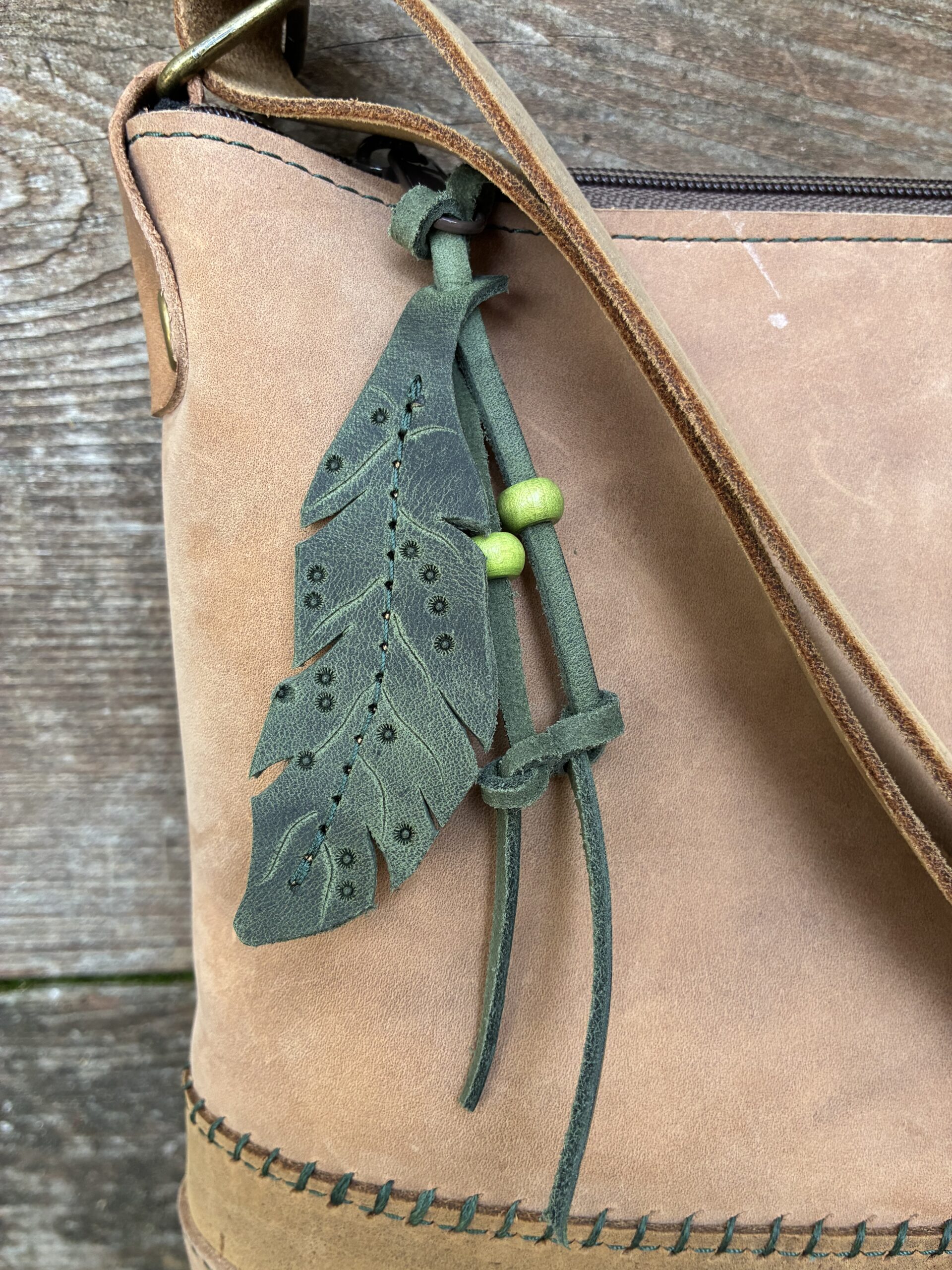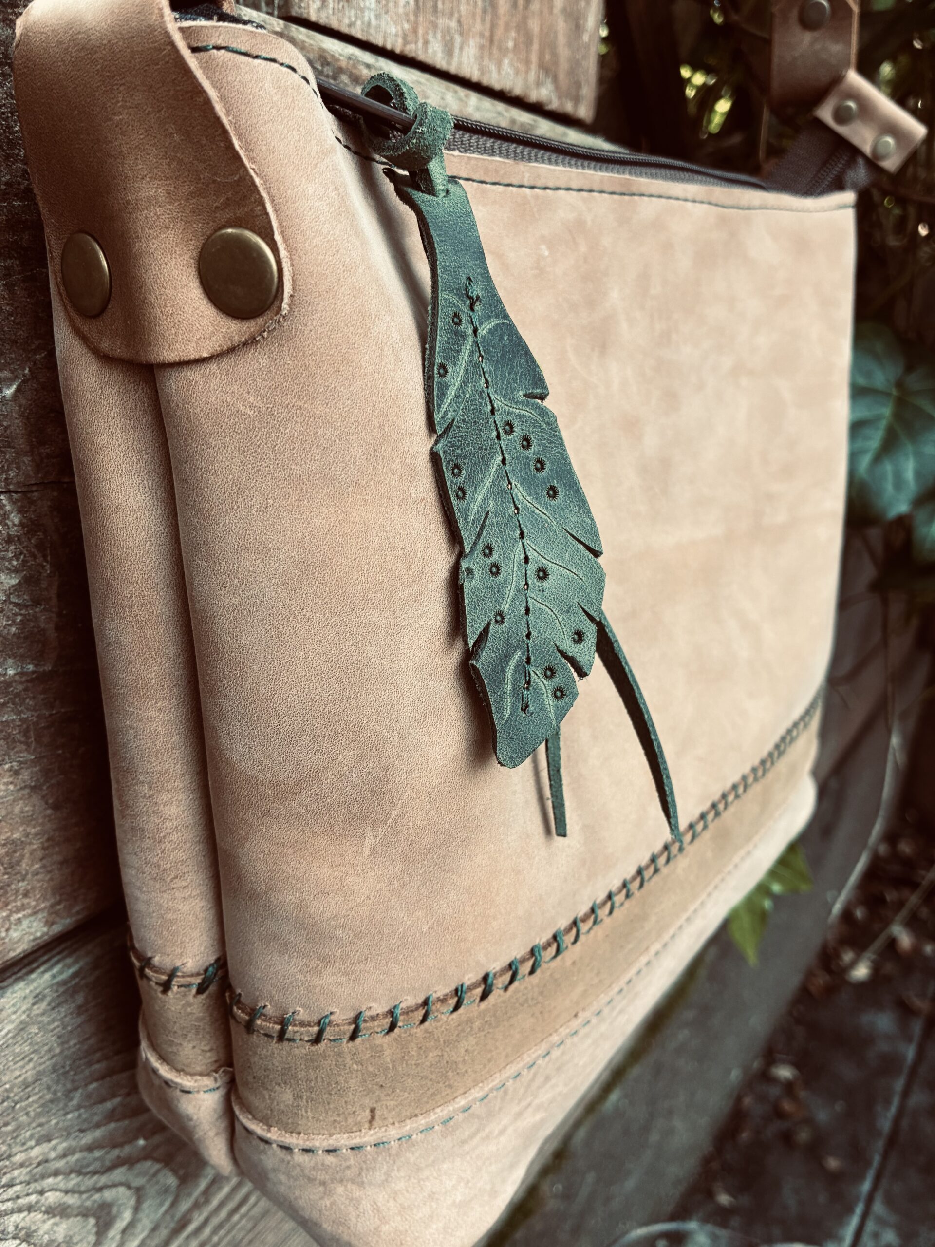 This bag features hand and machine stitching using Forest green threads, zipped outer pocket, zip closure and an adjustable 52” strap with antique brass hardware. The handcut feather pull is Evergreen forest leather.