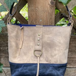 Natural tan and Navy bison, stitched with navy nylon thread. The stars and antique brass ring accents give it a rustic western look