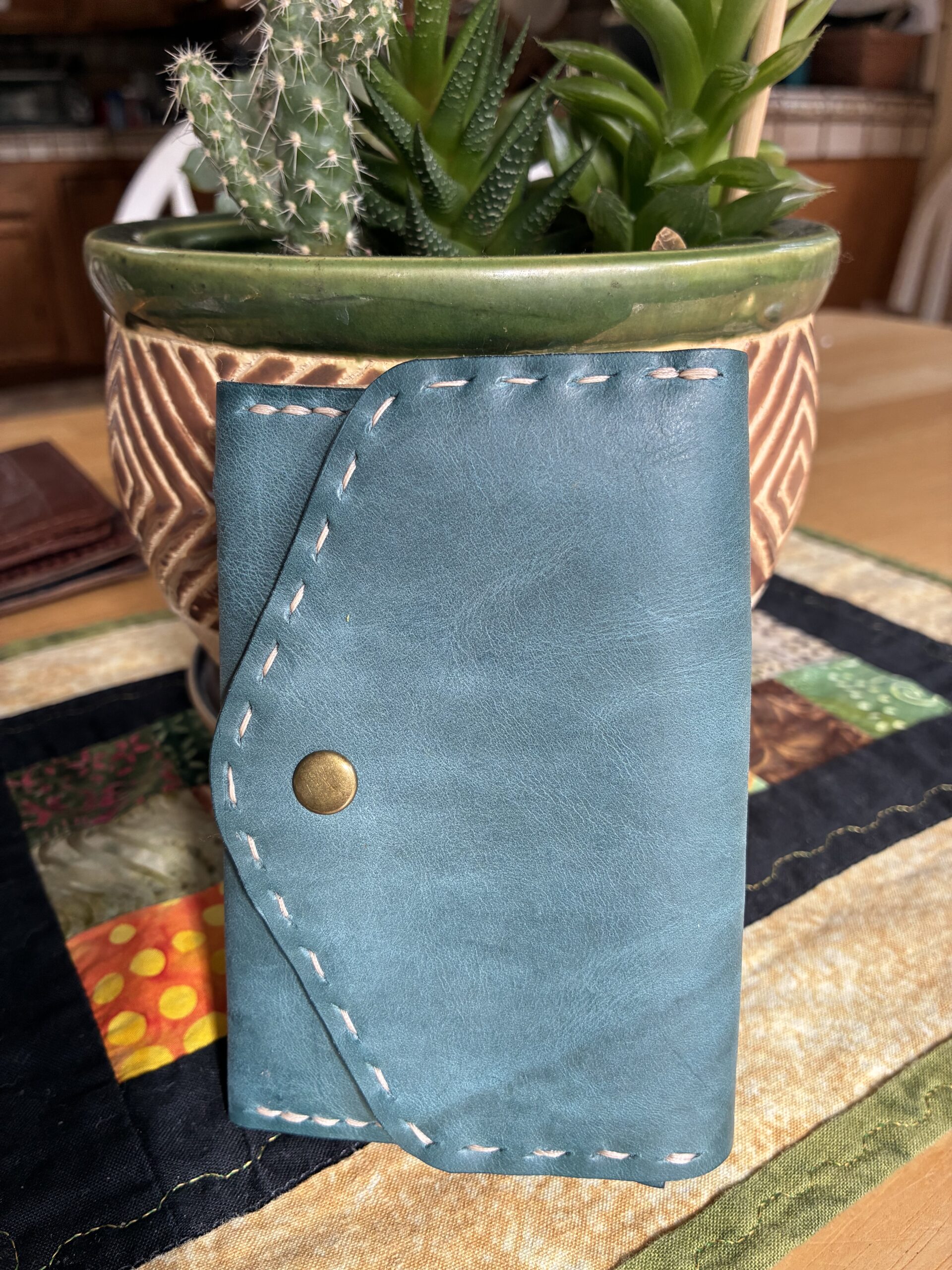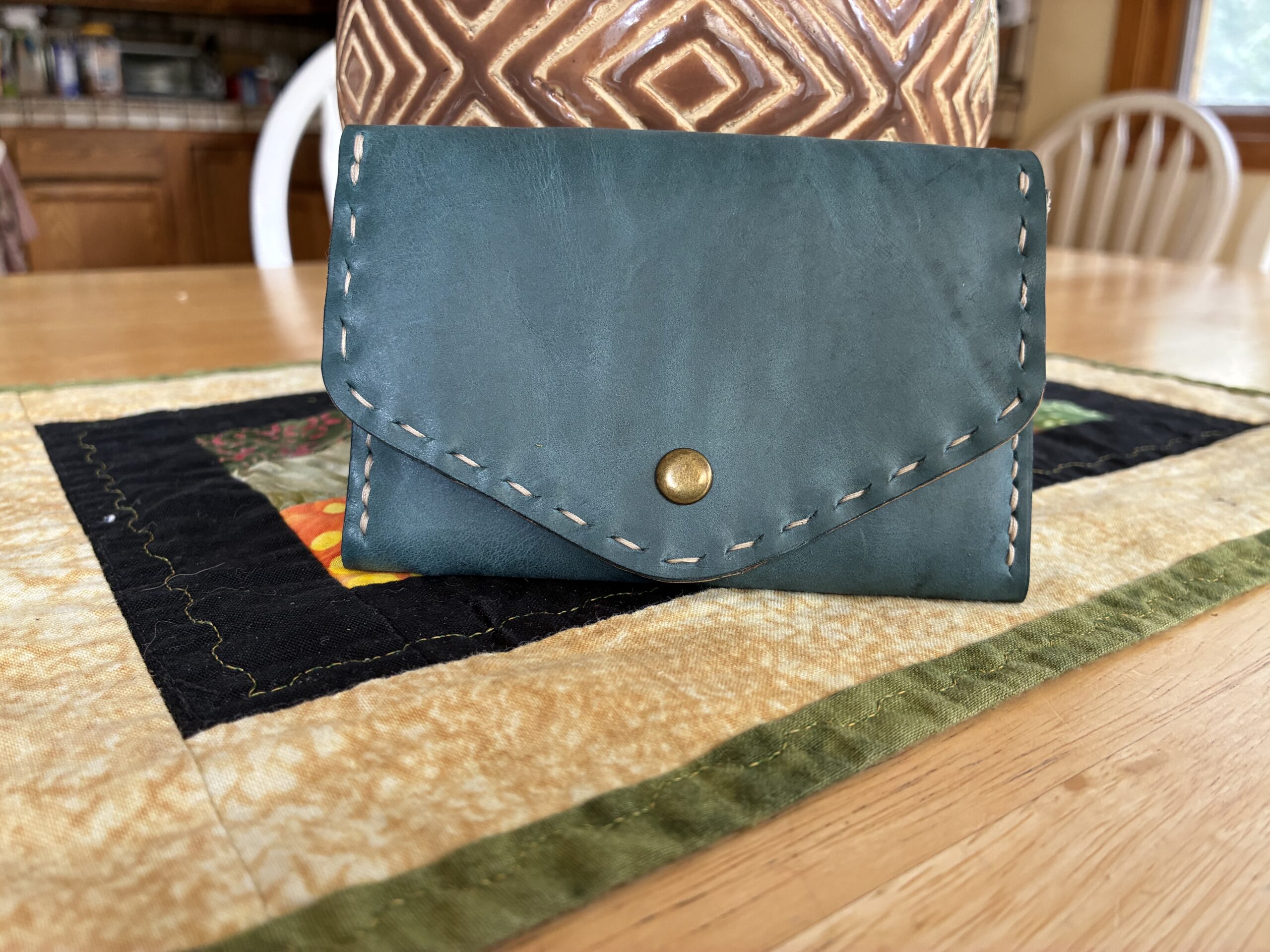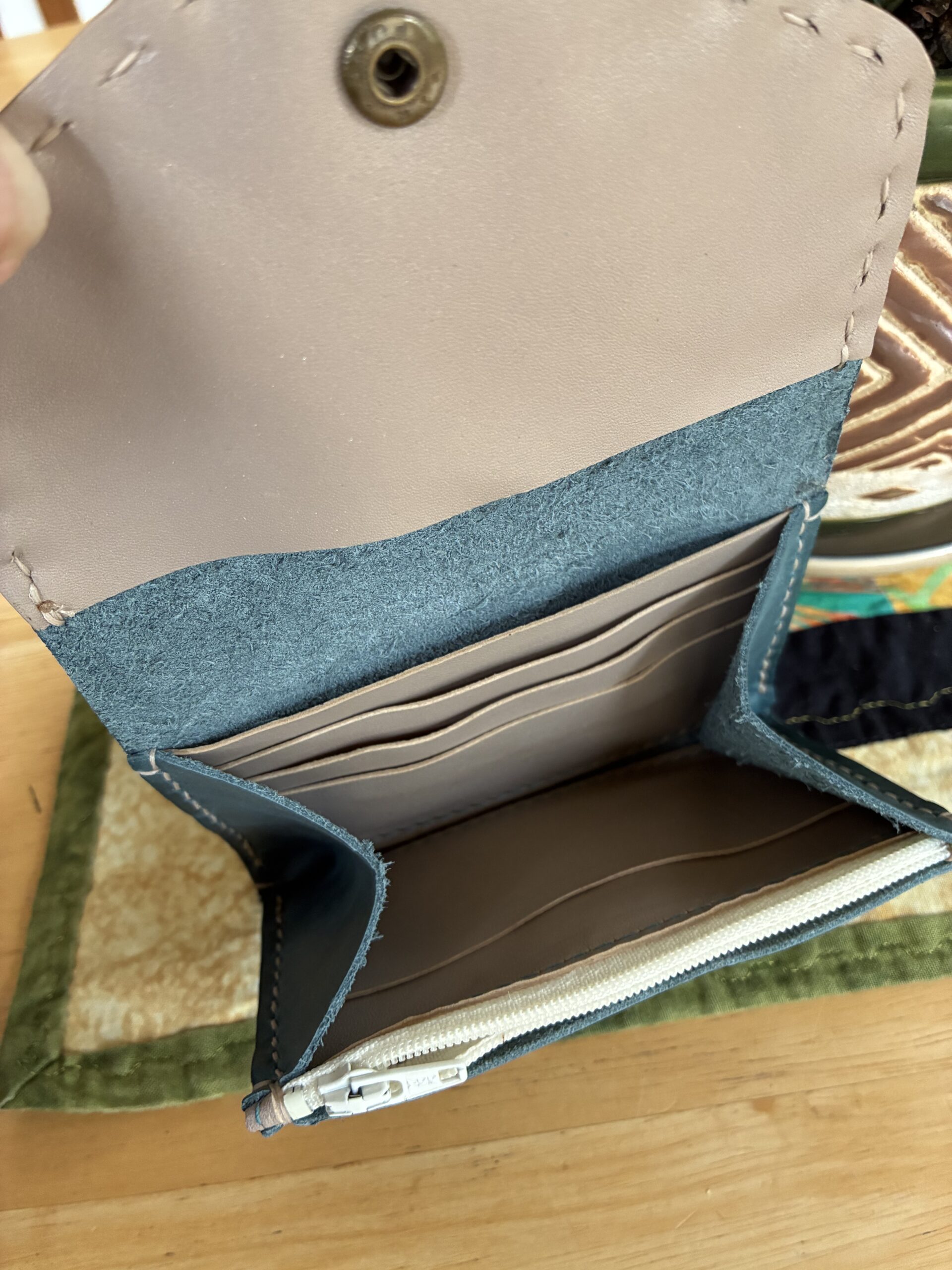 Sweet little teal leather wallet with 4 card slots plus 4 small compartments including a zipped coin pouch. Handstitched
