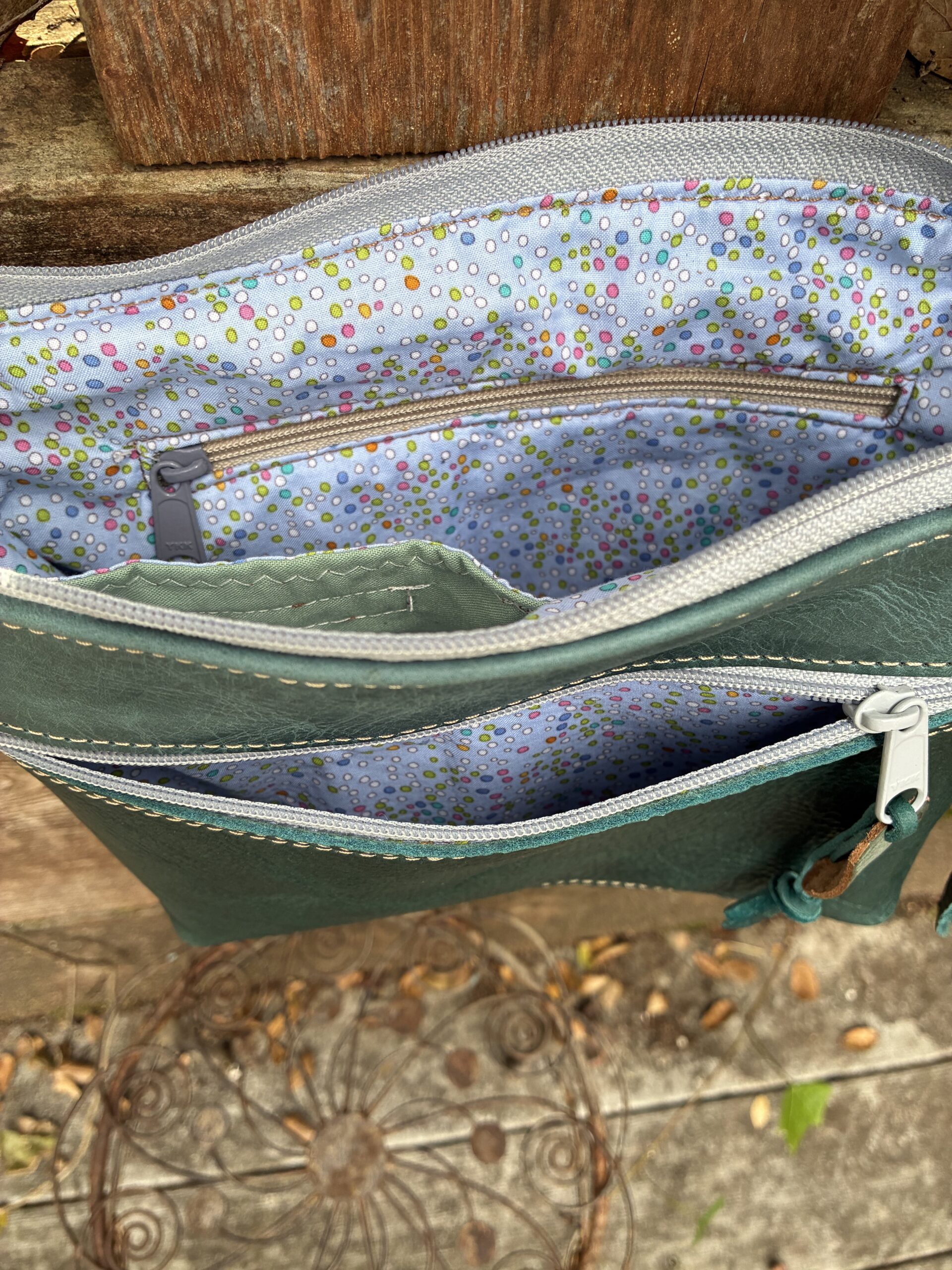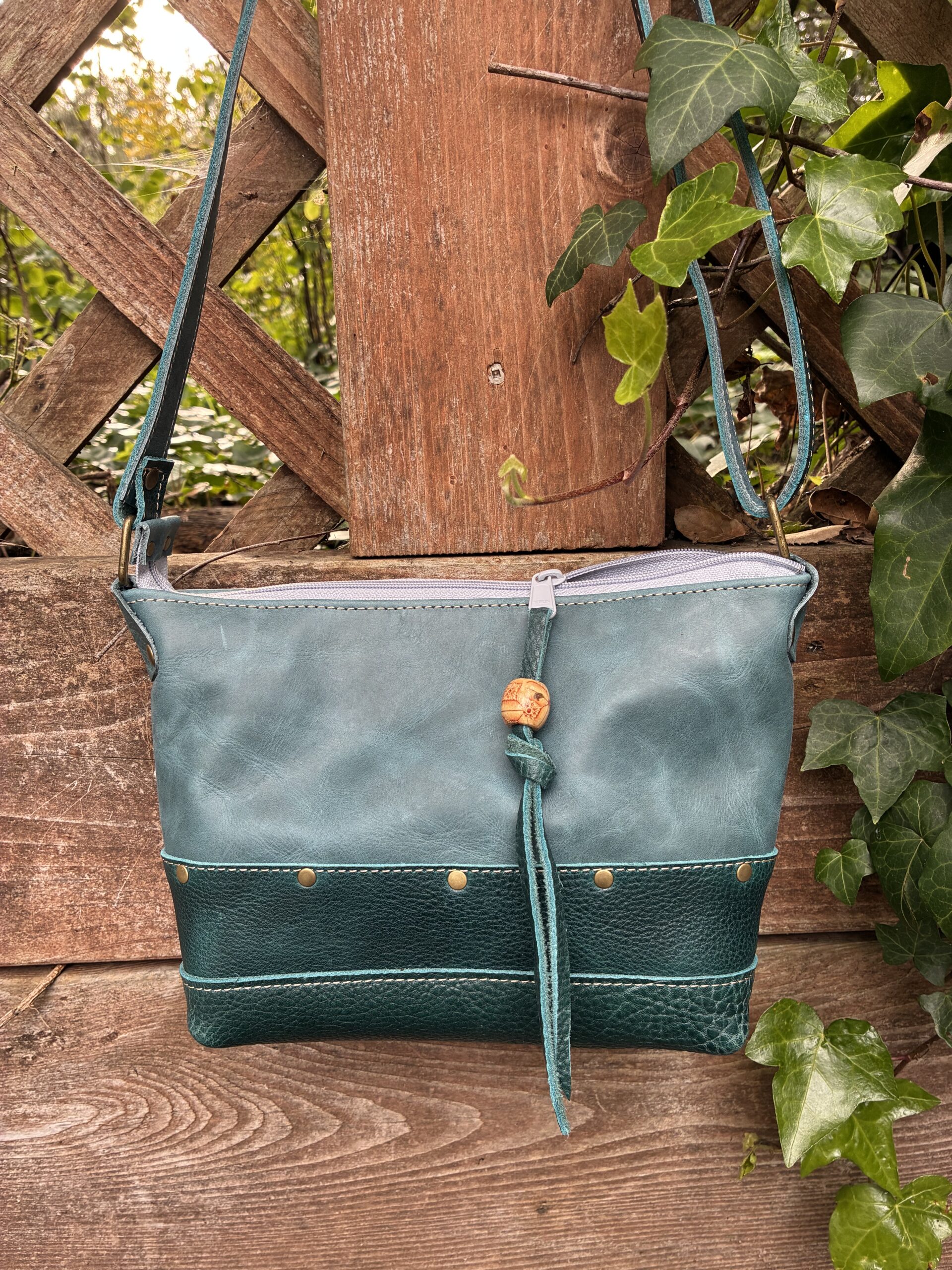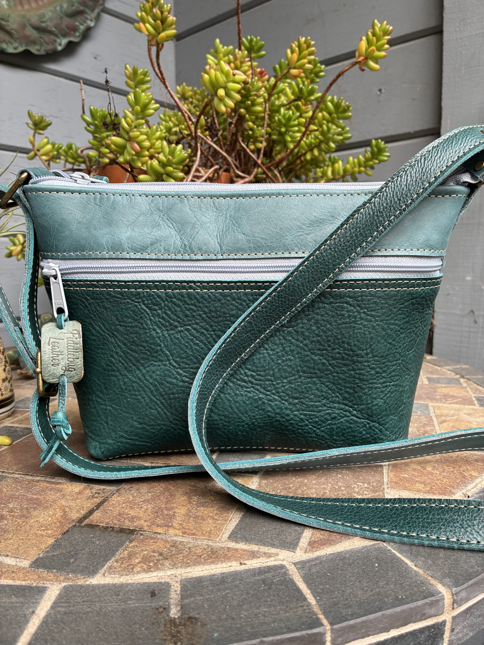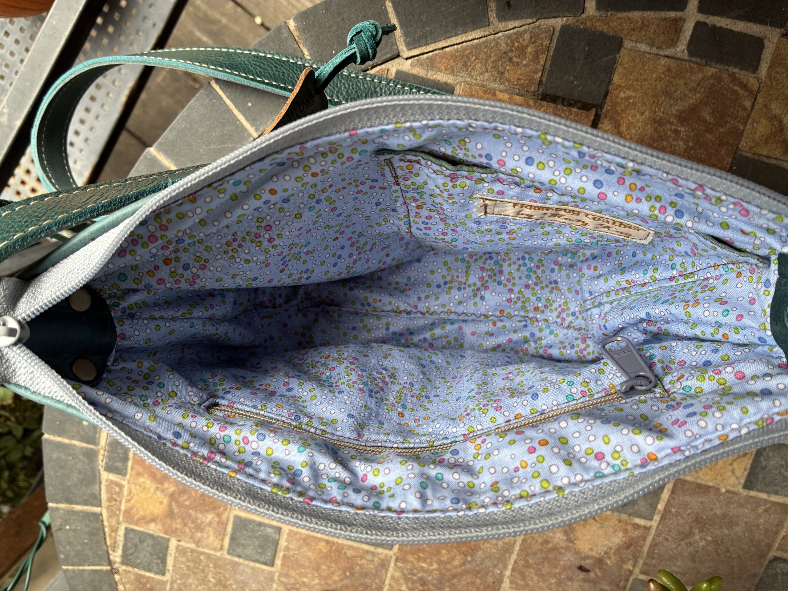 Love this two toned design. Includes a zip closure. Outer zip pocket, cotton lining featuring one open pockets and zip pocket.